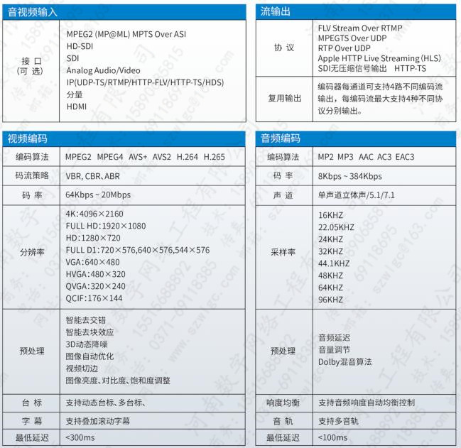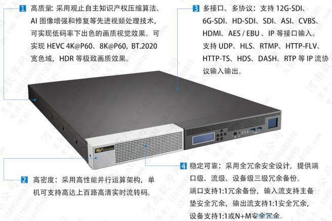 支持100路標清或25路高標清節(jié)目編轉(zhuǎn)碼;支持HEVC4K@P60、8K@P60,BT.2020寬色域HDR等較好畫質(zhì)效果,支持H.264/H.265/AVS+/DRA /MPEG2/4編轉(zhuǎn)碼,支持12G-SDI, 6GSDI,HD-SDI\SDI,ASI, CVBS,HDMS, AES/EBU,IP等輸入,支持UPD,HLS,RTMP, HTT P-FLV/TS,HDS, DASH,RTP等輸出.,碼率300k-100M