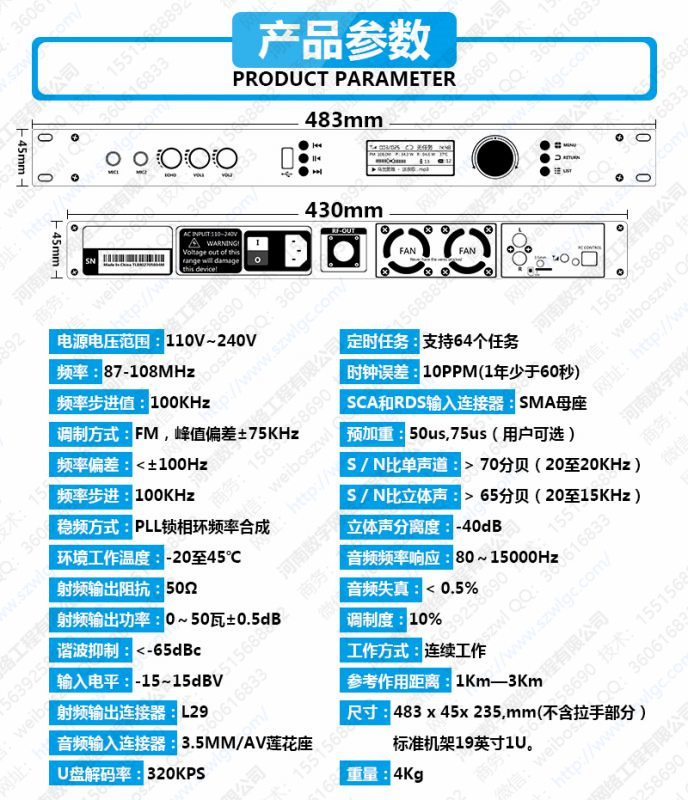 DNE-2550是一款改進型、結構堅固、穩定、操作簡單、音質產品,其主要特征如下: ●手機遙控開、關機等 ●自帶U盤播放 ●單/雙聲道模式可選; ●定時任務播放; ●可單獨設置任務工作頻率; ●斷電短信報警 ●散熱優良,風噪小 ●發射功率從0W到50W連續可調; ●駐波保護功能,當天線未接好或匹配不好,自動進入保護狀態; ●溫度保護功能,當機器溫度過高時,自動進入保護狀態。
