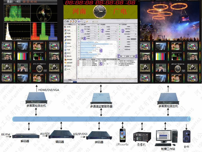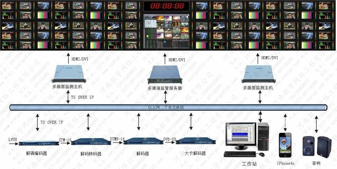 監(jiān)測前端系統(tǒng)信源接收,MPEG2/4、h.264、AVS+解調(diào)解碼,編碼復用,IP組播流封包,千兆交換,媒體路由,多通道管理,多畫面任意分割,數(shù)字化處理,通過大屏幕進行多畫面顯示和實時監(jiān)測信息顯示。監(jiān)測信息錄像存儲,故障報警。